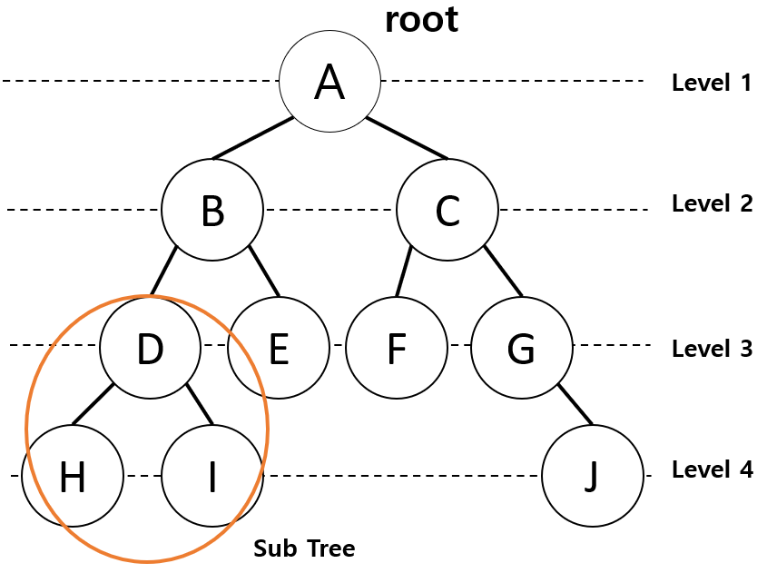 root에서 뻗어 나오는 큰 트리의 내부에 트리 구조를 갖춘 작은 트리를 서브 트리라고 한다. (D, H, I)로 이루어진 작은 트리도 서브 트리이고, (B, D, E) (C, F, G, J)도 서브 트리이다.