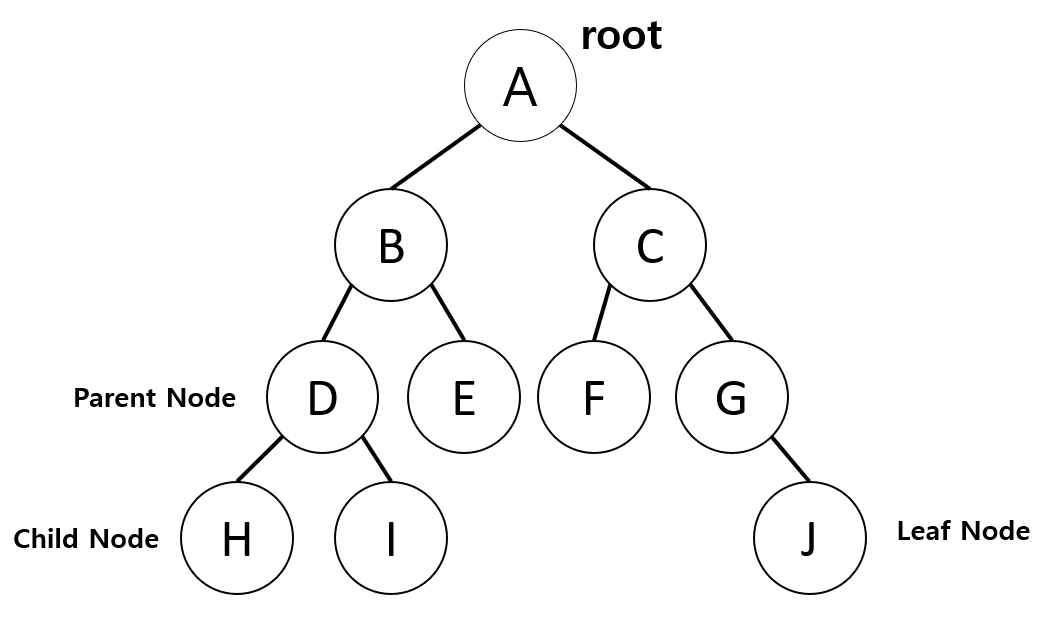 트리 구조는 루트(root)라는 하나의 꼭짓점 데이터를 시작으로 여러 개의 데이터를 간선(edge)으로 연결한다. 각 데이터를 노드(Node)라고 하며, 두 개의 노드가 상하 계층으로 연결되면 부모/자식 관계를 가진다. A는 B와 C의 부모 노드(Parent Node)이고, B와 C는 A의 자식 노드(Childe Node)이다. 자식이 없는 노드는 리프 노드(Leaf Node)라고 부른다.