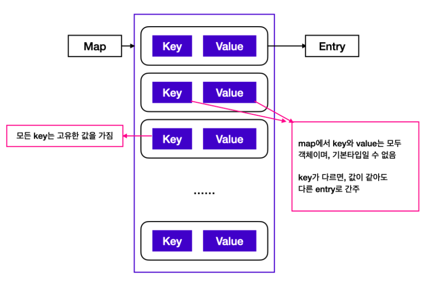 Map 인터페이스는 키(Key)와 값(Value)으로 구성된 객체를 저장하는 구조를 가지고 있다. 여기서 이 객체를 Entry 객체라고 하는데, 이 Entry 객체는 키와 값을 각각 Key 객체와 Value 객체로 저장한다. Map 인터페이스를 구현한 클래스에는 HashMap, HashTable, TreeMap, SortedMap 등이 있다.