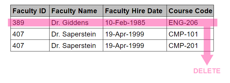 한 직원 데이터의 수업 관련 데이터를 지우기 위해서는 레코드 전체가 사라져 결국에는 의도치 않게 직원의 다른 데이터들도 같이 삭제되는 현상이 발생한다.