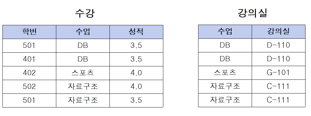 기존의 테이블에서 학번이 수업을 결정하고 있고 수업은 강의실을 결정하고 있다. 그렇기 때문에 아래와 같이 테이블을 분해해야 한다.