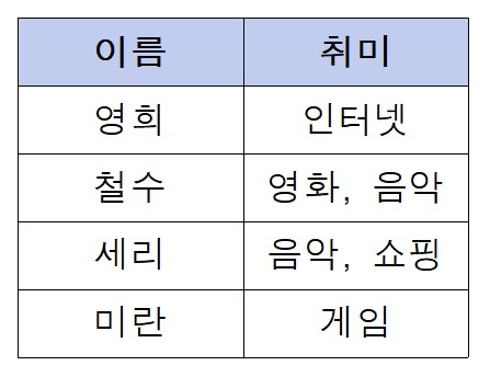 현재 테이블은 속성 하나는 하나의 속성값만을 가져야 한다는 1차 정규형에 위배된다.