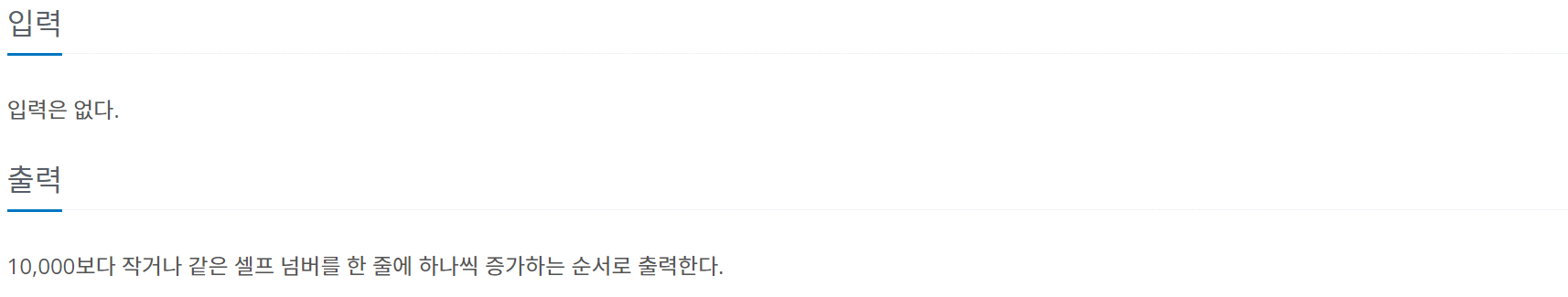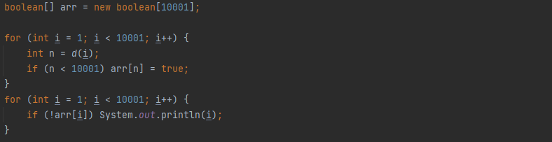 셀프 넘버는 1부터 10000까지 검사한 뒤, 생성자로 하는 수가 있으면 그 수를 출력하지 않는 것이다.