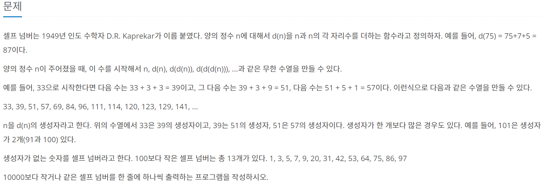셀프 넘버는 1949년 인도 수학자 D.R. Kaprekar가 이름 붙였다. 양의 정수 n에 대해서 d(n)을 n과 n의 각 자리수를 더하는 함수라고 정의하자. 예를 들어, d(75) = 75+7+5 = 87이다. 양의 정수 n이 주어졌을 때,